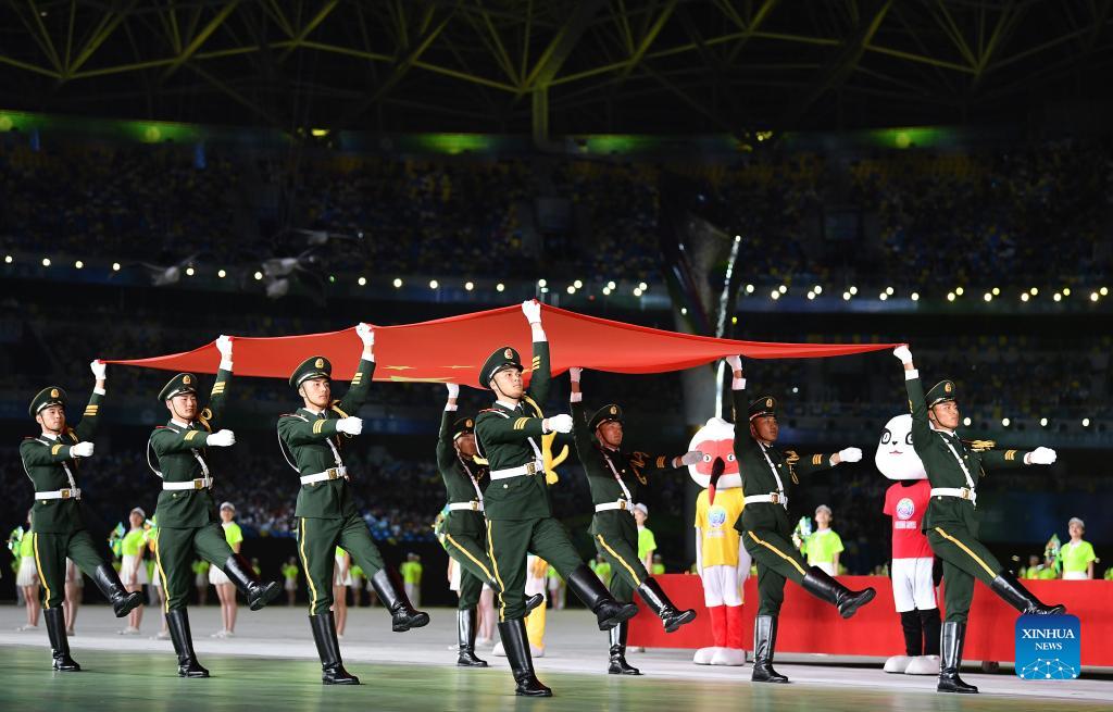The Chinese national flag is carried to the stadium during the opening ceremony for China's 14th National Games in Xi'an, Shaanxi Province, Sept. 15, 2021. (Xinhua/Zhang Bowen)