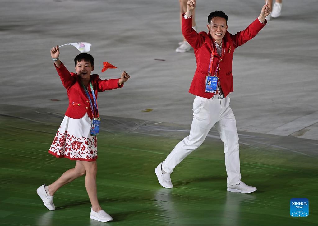 China's diver Quan Hongchan (L) and Xie Siyi of Guangdong Province Delegation parade into the stadium during the opening ceremony for China's 14th National Games in Xi'an, Shaanxi Province, Sept. 15, 2021. (Xinhua/Sun Fei)
