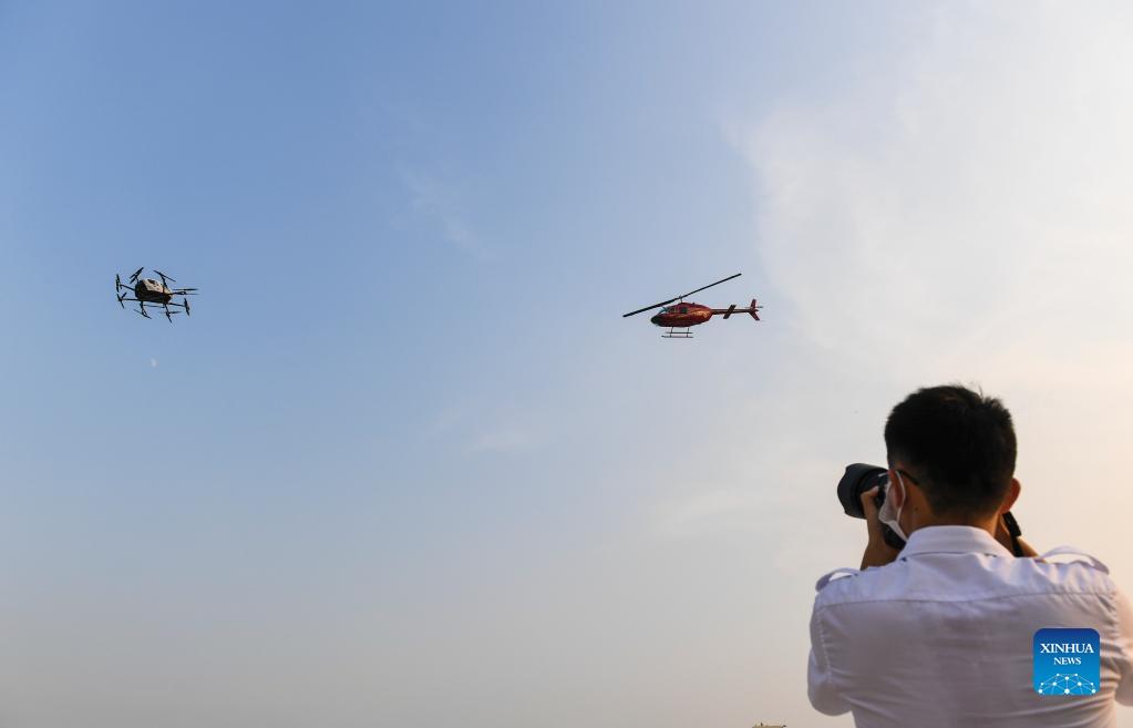 A Bell 206 helicopter (R) from HELI-EASTERN, a low-altitude general aviation carrier and helicopter service provider, and a passenger-grade autonomous aerial vehicle (AAV) from EHang, a leading AAV technology platform company, take demo flights in an integrated airspace in Shenzhen, south China's Guangdong Province, Sept. 15, 2021. EHang and HELI-EASTERN held a joint press conference Wednesday on building a pilot project focusing on integrated airspace for urban air mobility operations in the Guangdong-Hong Kong-Macao Greater Bay Area. (Xinhua/Mao Siqian)