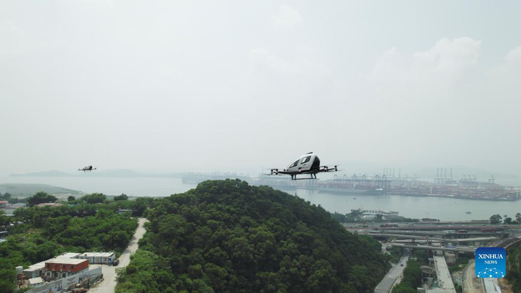 Aerial photo taken on Sept. 14, 2021 shows the demo flights of two passenger-grade autonomous aerial vehicles (AAV) from EHang, a leading AAV technology platform company, in an integrated airspace in Shenzhen, south China's Guangdong Province. EHang and HELI-EASTERN held a joint press conference Wednesday on building a pilot project focusing on integrated airspace for urban air mobility operations in the Guangdong-Hong Kong-Macao Greater Bay Area. (Xinhua)