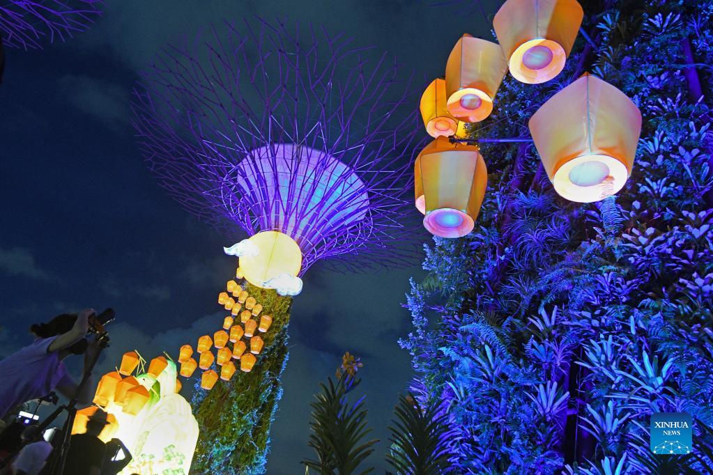 Photo taken on Sept. 15, 2021 shows lanterns at an event to greet the coming Mid-Autumn Festival at Singapore's Gardens by the Bay. (Xinhua/Then Chih Wey)