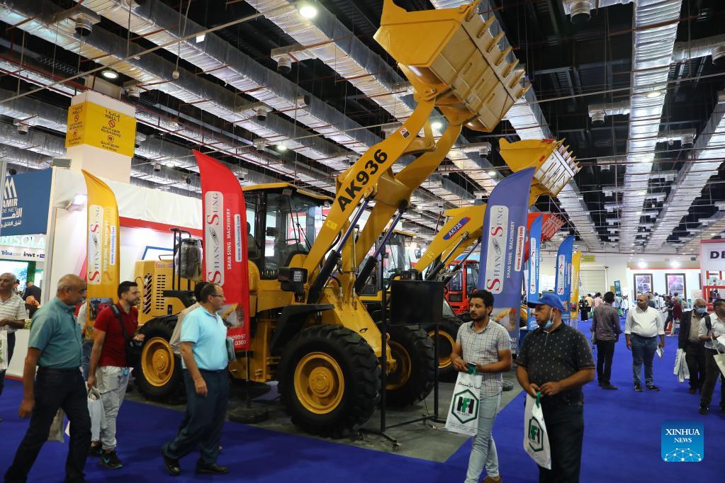 People visit a booth of Shansung Company, a Chinese heavy equipment producing firm, featuring wheel loaders, during the International Agricultural Exhibition for Africa and the Middle East in Cairo, Egypt, on Sept. 13, 2021. Egyptian-Chinese business partners presenting a variety of agricultural products and machinery stood out among exhibitors at the 33rd edition of Egypt's largest annual expo Sahara, the International Agricultural Exhibition for Africa and the Middle East. (Xinhua/Ahmed Gomaa)