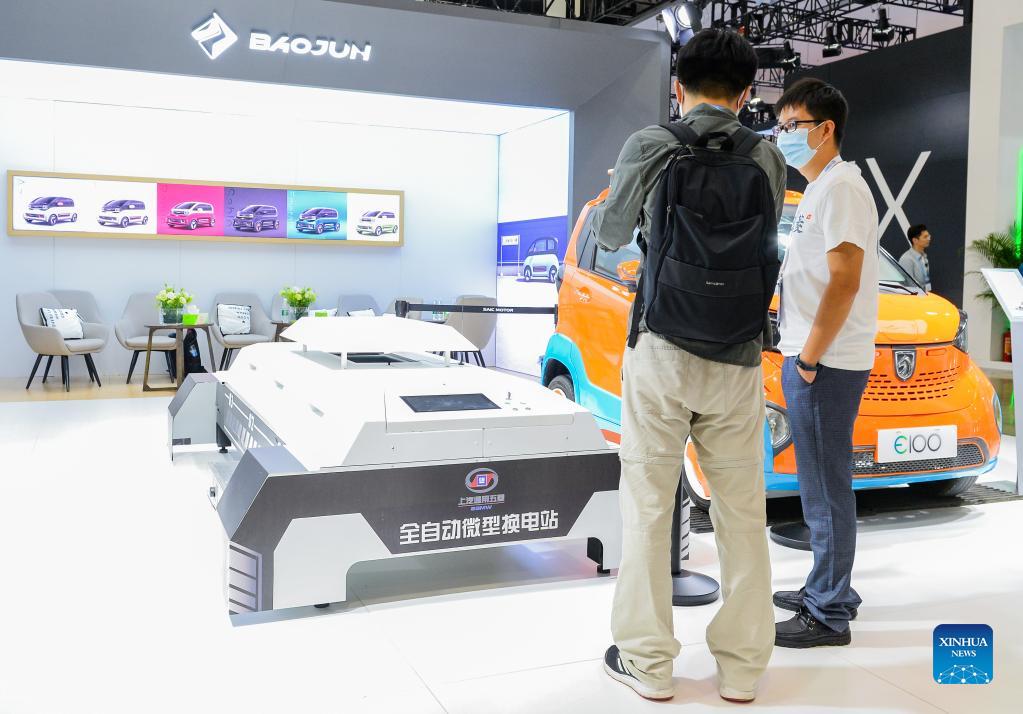 A staff member introduces an exhibit at the 2021 World New Energy Vehicle Congress (WNEVC) in Haikou, capital of south China's Hainan Province, Sept. 15, 2021. The 2021 WNEVC kicked off on Wednesday in Haikou, focusing on the new energy vehicle industry under the background of carbon neutrality. Themed "Comprehensively promoting marketization, accelerating cross-industry integration, jointly achieving carbon neutrality," the three-day event will feature several summits, forums, exhibitions and other activities. (Xinhua/Zhou Jiayi)