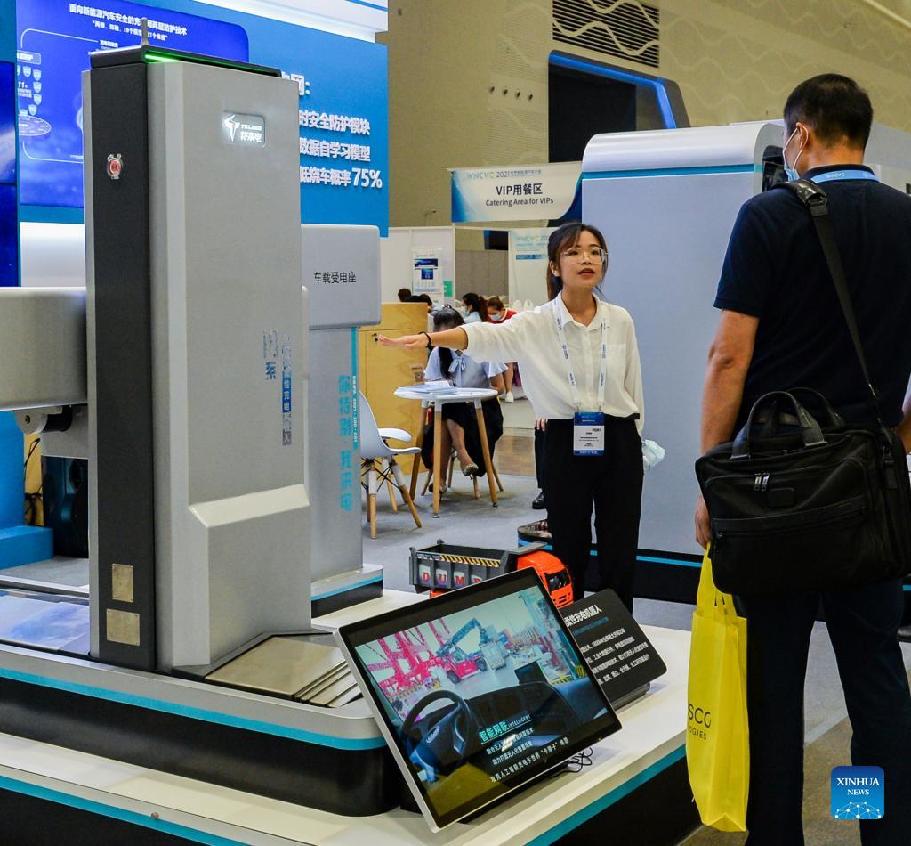 A staff member introduces a charging robot to a visitor at the 2021 World New Energy Vehicle Congress (WNEVC) in Haikou, capital of south China's Hainan Province, Sept. 15, 2021. The 2021 WNEVC kicked off on Wednesday in Haikou, focusing on the new energy vehicle industry under the background of carbon neutrality. Themed "Comprehensively promoting marketization, accelerating cross-industry integration, jointly achieving carbon neutrality," the three-day event will feature several summits, forums, exhibitions and other activities. (Xinhua/Zhou Jiayi)
