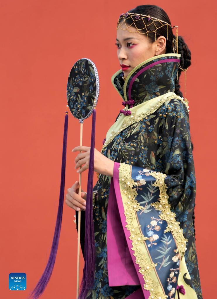 A model presents a creation designed by Zhang Yichao during the Beijing Fashion Week in Beijing, capital of China, Sept. 15, 2021. The 12-day event kicked off in Beijing on Wednesday. (Xinhua/Chen Jianli)