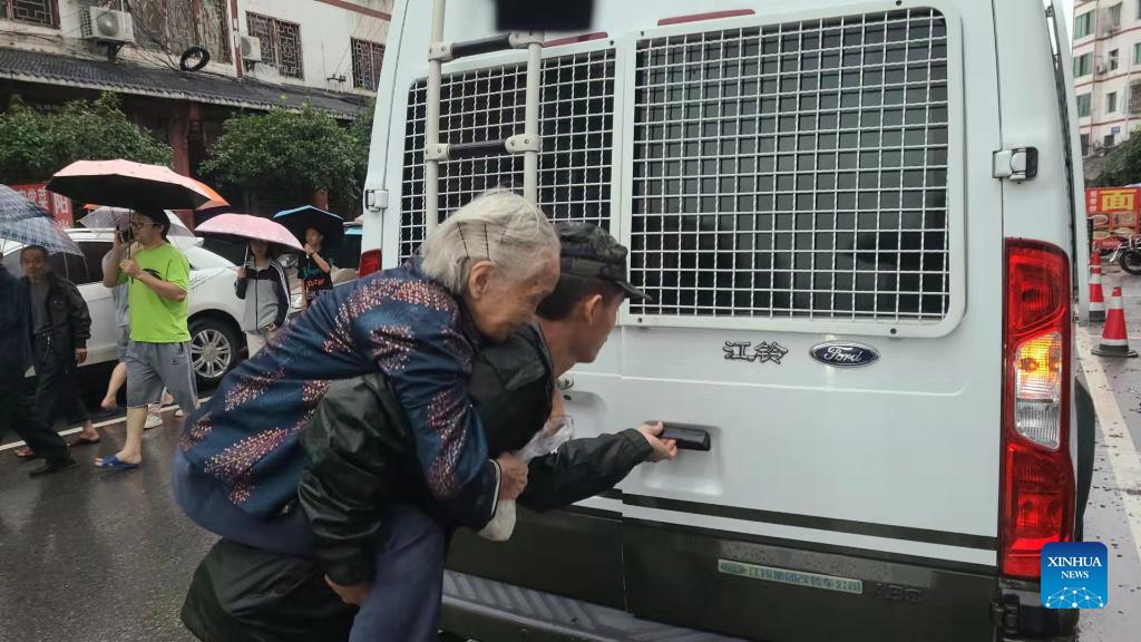 Photo taken with a mobile phone on Sept. 16, 2021 shows a rescuer transferring a senior woman to a safe location in Fuji Town of Luxian County, southwest China's Sichuan Province. Two people were dead and three others injured after a 6.0-magnitude earthquake jolted Luxian County at 4:33 a.m. Thursday (2033 GMT Wednesday). The quake also damaged houses. (Xinhua)