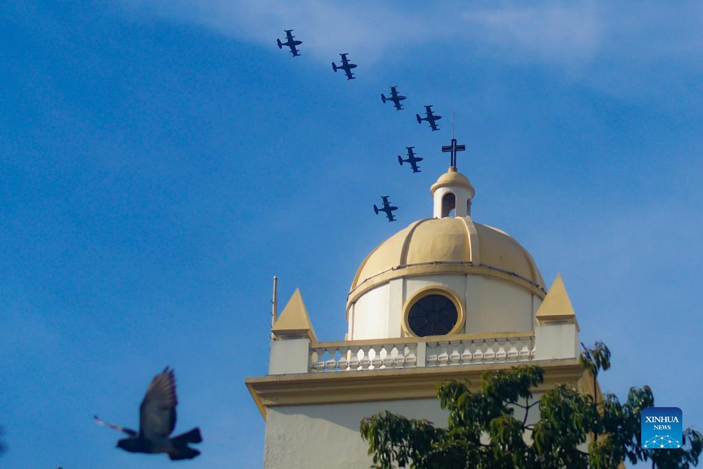 Cessna A-37 Dragonfly airplanes take part in the commemoration of the Bicentennial of Independence in Central America, in San Salvador department, El Salvador, on Sept. 15, 2021. El Salvador, Guatemala, Honduras, Nicaragua and Costa Rica commemorated the Bicentennial of Independence of Central America on Sept. 15. (Photo by Alexander Pena/Xinhua)