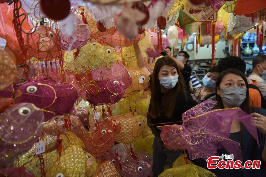 People shop for lanterns on "Lantern Street," a dozens of meters long passage in Tai Kiu Market, in Yuen Long, Hong Kong Special Administrative Region. (Photo: China News Service/Li Zhihua)
