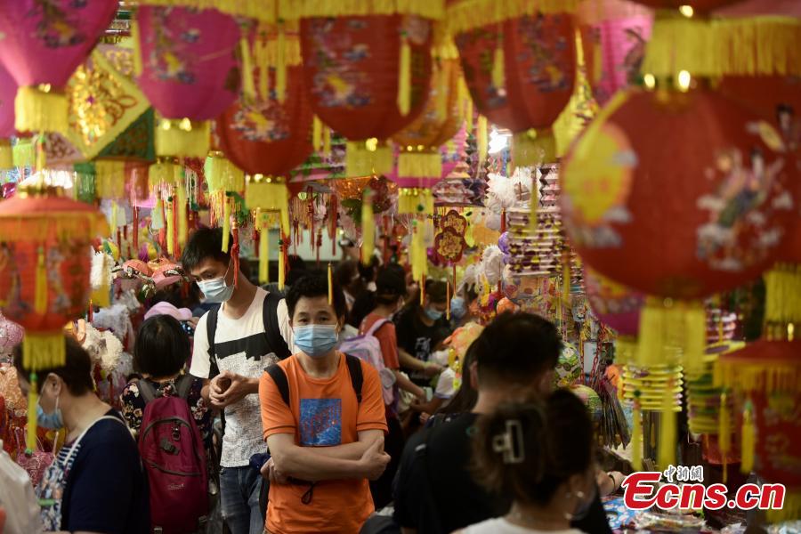 People shop for lanterns on "Lantern Street," a dozens of meters long passage in Tai Kiu Market, in Yuen Long, Hong Kong Special Administrative Region. As the Mid-Autumn Festival approaches, nearly 1,000 traditional handmade lanterns have been hung up on the street to attract shoppers. (Photo: China News Service/Li Zhihua)