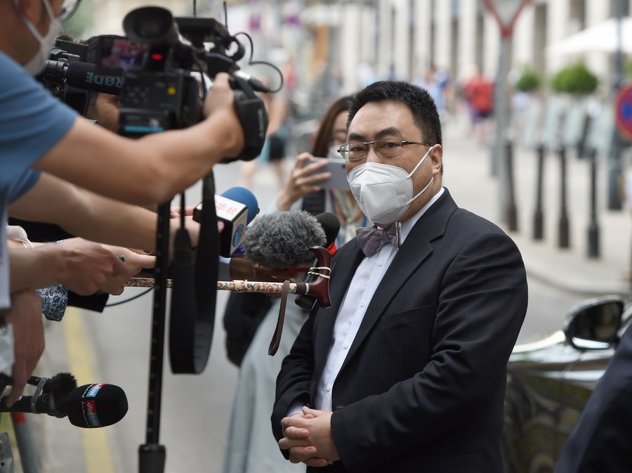 Wang Qun (R, Front), Chinese envoy to the United Nations and other international organizations in Vienna, is interviewed after a meeting of the Joint Comprehensive Plan of Action (JCPOA) Joint Commission in Vienna, Austria, on June 12, 2021. (Xinhua/Guo Chen)