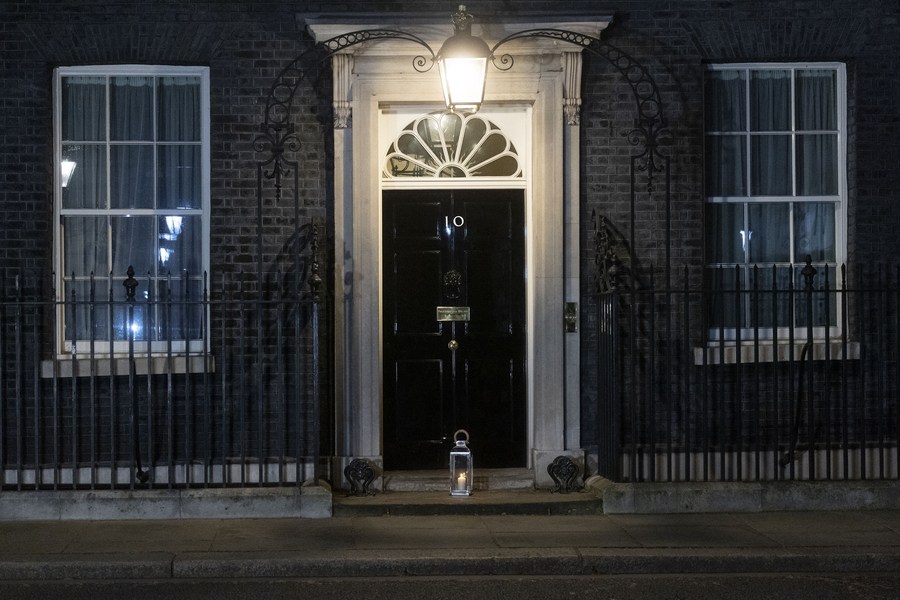 A lantern is seen on the doorstep of 10 Downing Street in London, Britain, on March 23, 2021. (Xinhua/Ray Tang)