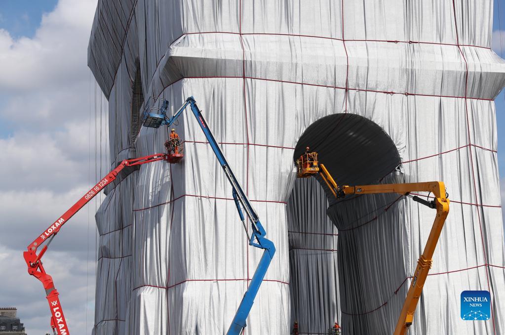 Workers put the finishing touches on the wrapped Arc de Triomphe in Paris, France, on Sept. 16, 2021. The entire Arc de Triomphe at the top of the Champs-Elysees in Paris is to stay wrapped in fabric for two weeks, an art installation conceived by the late artist Christo and inaugurated on Thursday by French President Emmanuel Macron. The 50-meter high, 45-meter long and 22-meter wide monument built by Napoleon, is now wrapped head to toe in 25,000 square metres of recyclable silvery-blue fabric and 3,000 meters of red rope. (Xinhua/Gao Jing)