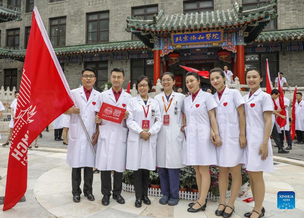Medical workers pose for photos after a celebration marking the 100th anniversary of the founding of Peking Union Medical College Hospital (PUMCH) in Beijing, capital of China, Sept. 16, 2021. (Xinhua/Zhang Yuwei)