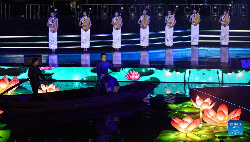 People perform during the opening ceremony of a lantern fair celebrating the Mid-Autumn Festival in Zhouzhuang Township of Kunshan City, east China's Jiangsu Province, Sept. 16, 2021. (Xinhua/Yang Lei)
