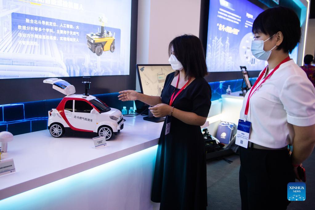 A staff member (L) introduces an exhibit at the first International Summit on BeiDou Navigation Satellite System (BDS) Applications, in Changsha, central China's Hunan Province, Sept. 16, 2021. The First International Summit on BDS Applications opened Thursday with the theme "BDS serves the world, application fuels the future." (Xinhua/Chen Sihan)