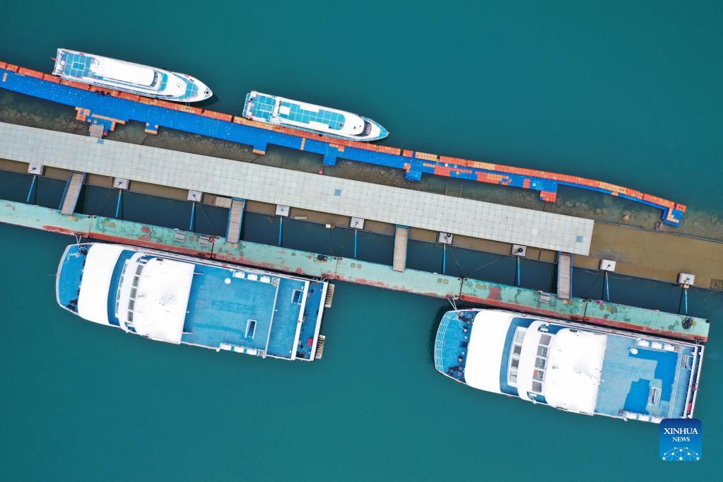 In this aerial photo, boats are moored to a pier in Qinghai Lake in northwest China's Qinghai Province, Sept. 15, 2021. Located in the northeastern part of the Qinghai-Tibet Plateau, the Qinghai Lake is key to maintaining the ecological balance in western China. It is also a natural barrier for controlling the eastward spread of desertification and ensuring the safety of agricultural areas in eastern China. In recent years, the Chinese government has implemented various ecological projects in the Qinghai Lake Basin, and achieved remarkable results in restoring the environment. (Xinhua/Xing Guangli)