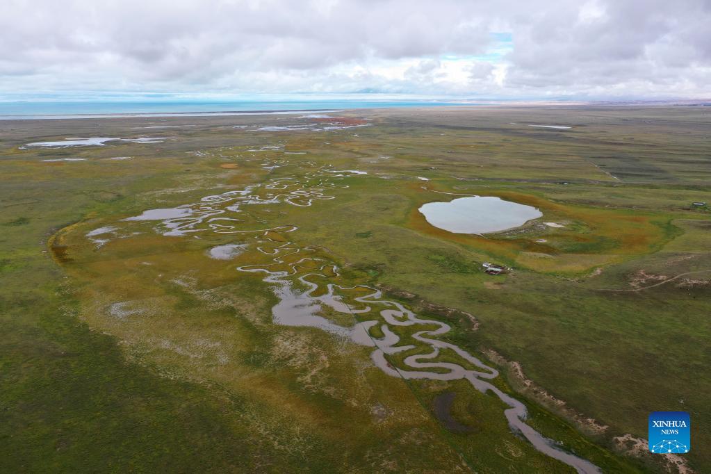 Aerial photo taken on Sept. 15, 2021 shows a river near the Qinghai Lake in northwest China's Qinghai Province. Located in the northeastern part of the Qinghai-Tibet Plateau, the Qinghai Lake is key to maintaining the ecological balance in western China. It is also a natural barrier for controlling the eastward spread of desertification and ensuring the safety of agricultural areas in eastern China. In recent years, the Chinese government has implemented various ecological projects in the Qinghai Lake Basin, and achieved remarkable results in restoring the environment. (Xinhua/Xing Guangli)