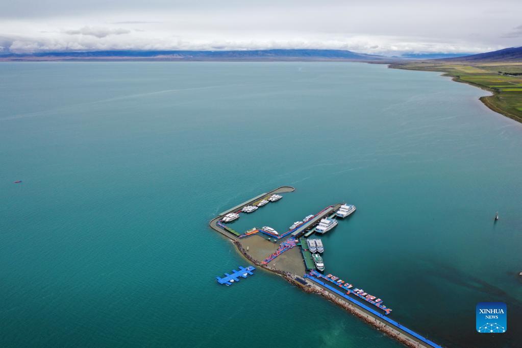 In this aerial photo, boats are moored to a pier in Qinghai Lake in northwest China's Qinghai Province, Sept. 15, 2021. Located in the northeastern part of the Qinghai-Tibet Plateau, the Qinghai Lake is key to maintaining the ecological balance in western China. It is also a natural barrier for controlling the eastward spread of desertification and ensuring the safety of agricultural areas in eastern China. In recent years, the Chinese government has implemented various ecological projects in the Qinghai Lake Basin, and achieved remarkable results in restoring the environment. (Xinhua/Xing Guangli)