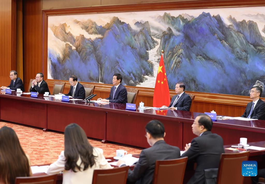Li Zhanshu, chairman of the National People's Congress (NPC) Standing Committee, holds talks with Bahrain's parliament speaker Fawzia bint Abdulla Zainal via video link in Beijing, capital of China, Sept. 15, 2021. (Xinhua/Wang Ye)