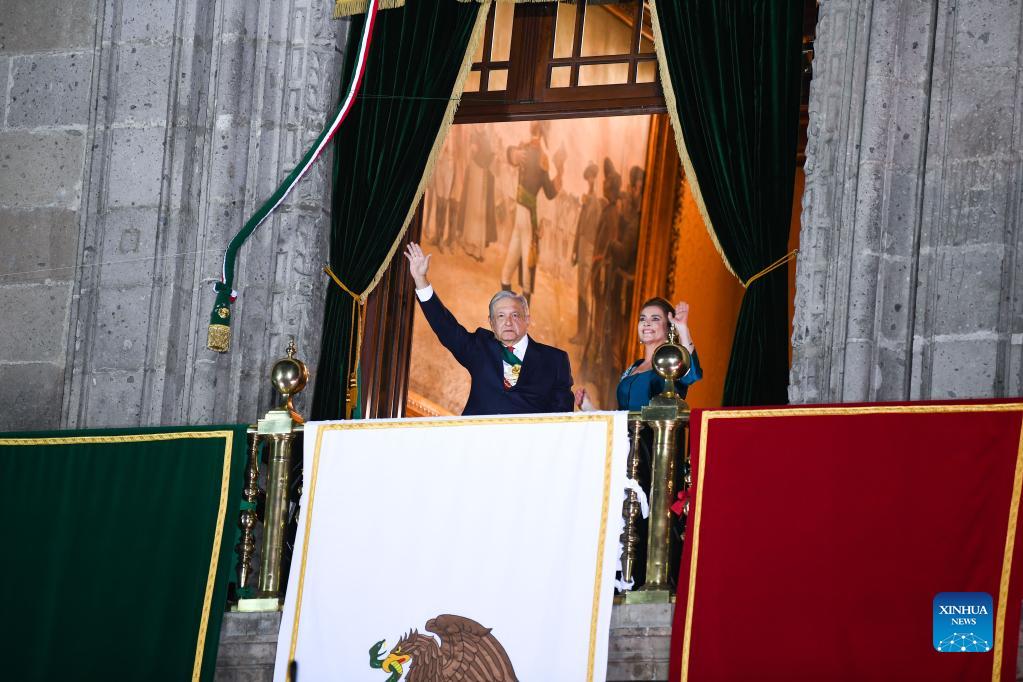 Mexican President Andres Manuel Lopez Obrador (L) and his wife wave to the people at the National Palace during the Independence Day celebrations in Mexico City, capital of Mexico, Sept. 15, 2021. (Xinhua/Xin Yuewei)