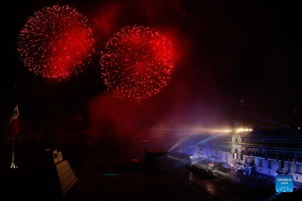 Fireworks explode during the Independence Day celebrations in Mexico City, capital of Mexico, Sept. 15, 2021. (Photo by Francisco Canedo/Xinhua)