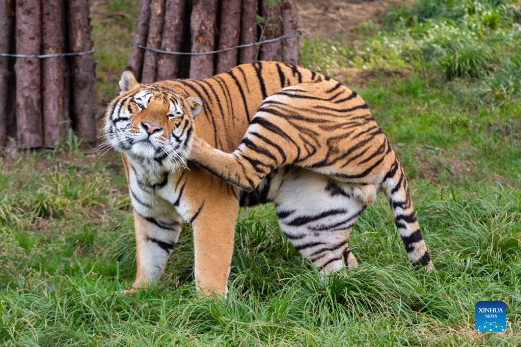 A Siberian tiger scratches itself at a forest park under the China Hengdaohezi Feline Breeding Center in northeast China's Heilongjiang Province, Sept. 15, 2021. (Xinhua/Xie Jianfei)