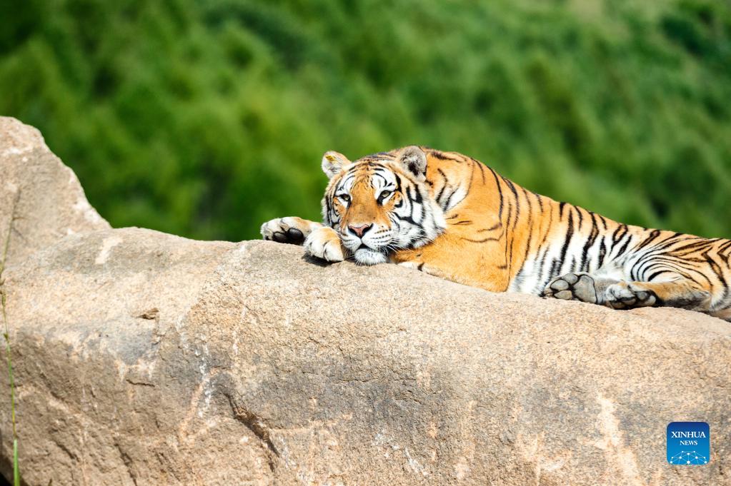 A Siberian tiger rests on a rock at a forest park under the China Hengdaohezi Feline Breeding Center in northeast China's Heilongjiang Province, Sept. 15, 2021. (Xinhua/Xie Jianfei)