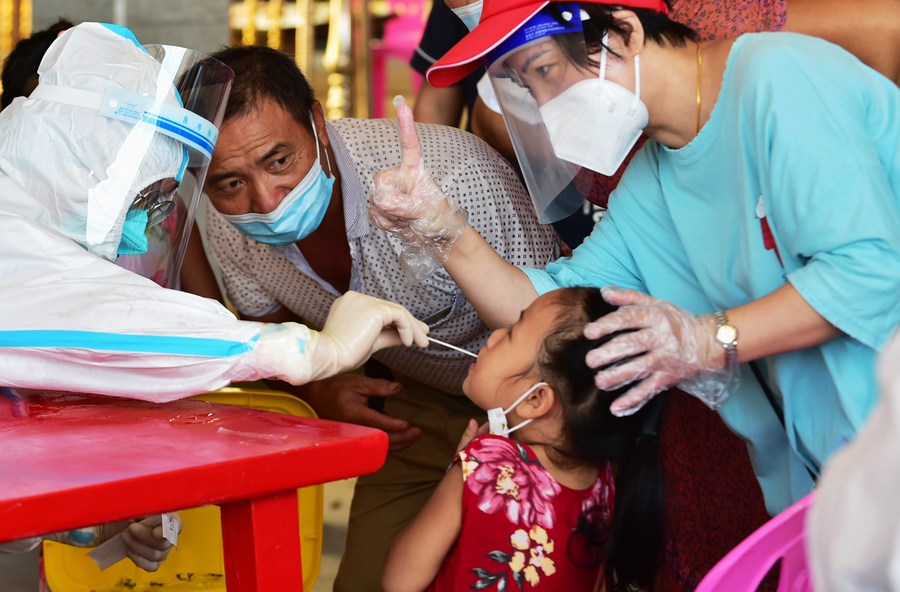 A health worker collects swab sample from a girl for nucleic acid testing in Xianyou County, Putian City, east China's Fujian Province, Sept. 16, 2021.(Xinhua/Wei Peiquan)