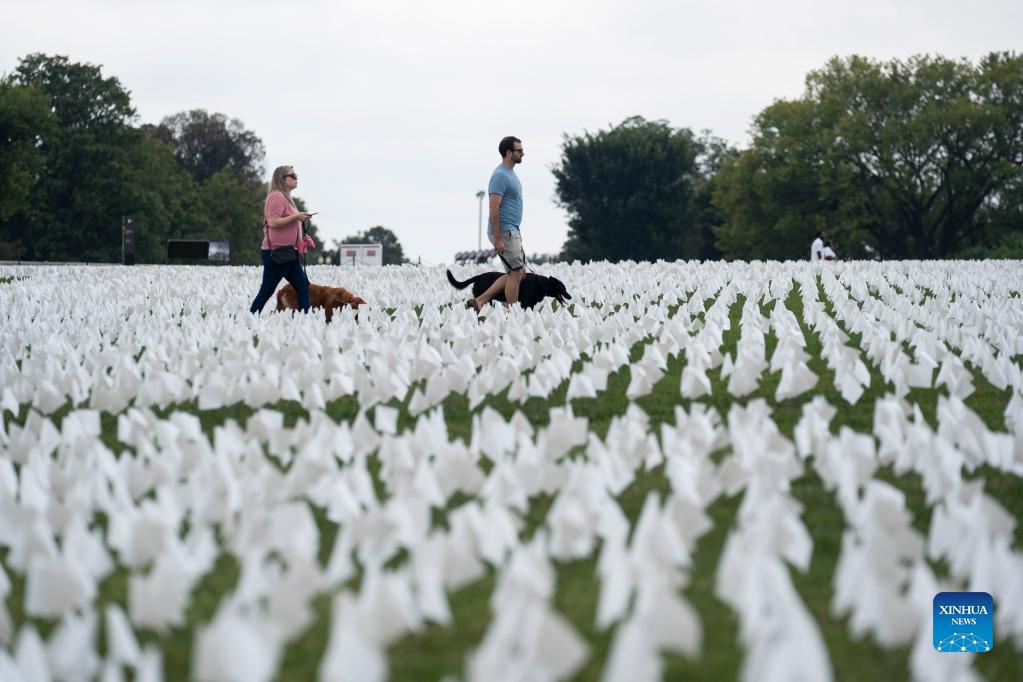People walk past white flags on the National Mall in Washington, D.C., the United States, on Sept. 16, 2021. More than 660,000 white flags were installed here to honor the lives lost to COVID-19 in the United States. (Xinhua/Liu Jie)