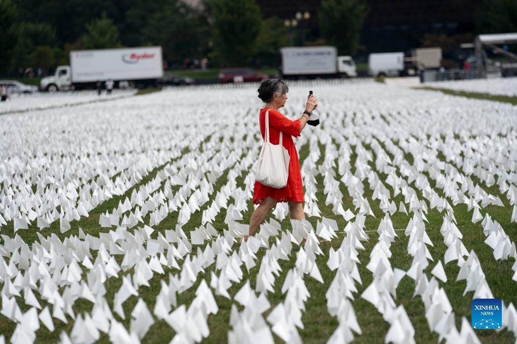 A woman walks past white flags on the National Mall in Washington, D.C., the United States, on Sept. 16, 2021. More than 660,000 white flags were installed here to honor the lives lost to COVID-19 in the United States. (Xinhua/Liu Jie)