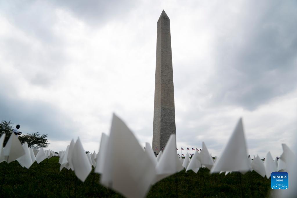 White flags are seen on the National Mall in Washington, D.C., the United States, on Sept. 16, 2021. More than 660,000 white flags were installed here to honor the lives lost to COVID-19 in the United States. (Xinhua/Liu Jie)