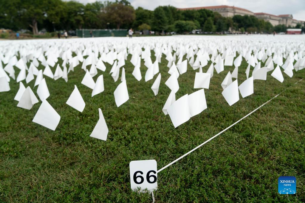White flags are seen on the National Mall in Washington, D.C., the United States, on Sept. 16, 2021. More than 660,000 white flags were installed here to honor the lives lost to COVID-19 in the United States. (Xinhua/Liu Jie)