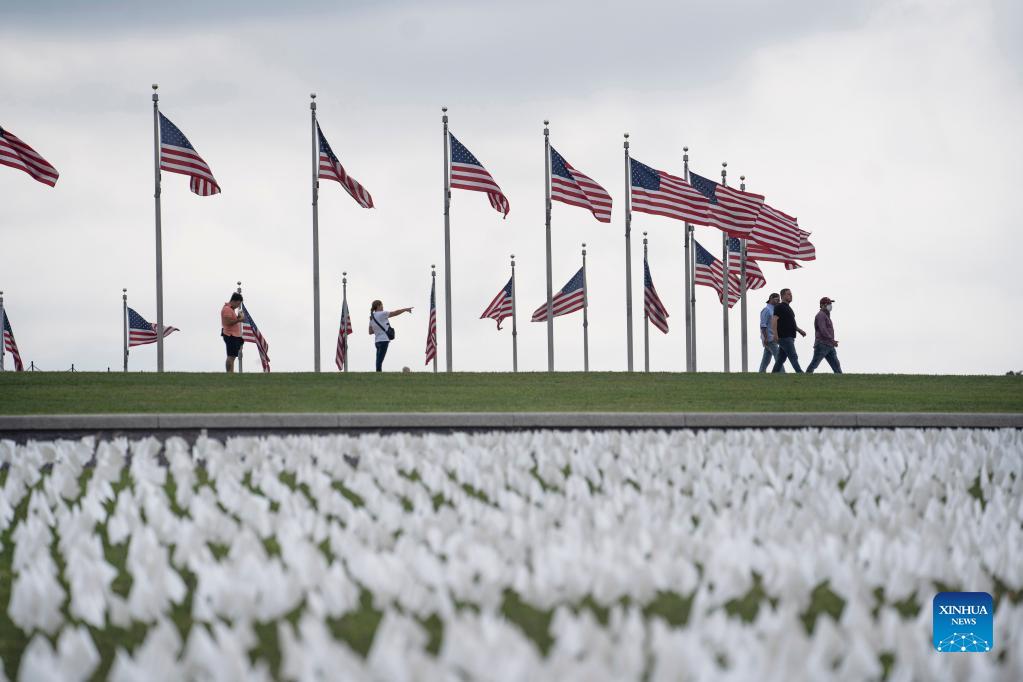 White flags are seen on the National Mall in Washington, D.C., the United States, on Sept. 16, 2021. More than 660,000 white flags were installed here to honor the lives lost to COVID-19 in the United States. (Xinhua/Liu Jie)