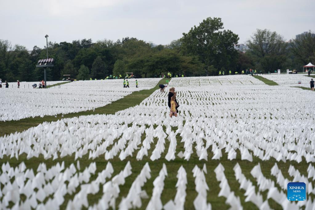 People walk past white flags on the National Mall in Washington, D.C., the United States, on Sept. 16, 2021. More than 660,000 white flags were installed here to honor the lives lost to COVID-19 in the United States. (Xinhua/Liu Jie)