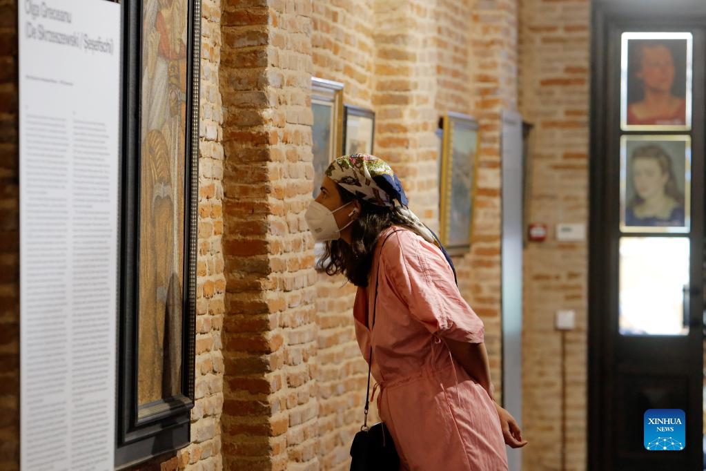 A woman views an artwork at Art Safari exhibition in Bucharest, Romania, on Sept. 16, 2021. Art Safari is an annual cultural event aimed at bringing classical and contemporary artworks closer to the public. (Photo by Cristian Cristel/Xinhua)