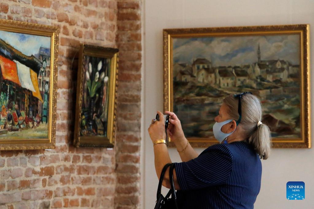 A woman takes photos of an artwork at Art Safari exhibition in Bucharest, Romania, on Sept. 16, 2021. Art Safari is an annual cultural event aimed at bringing classical and contemporary artworks closer to the public. (Photo by Cristian Cristel/Xinhua)