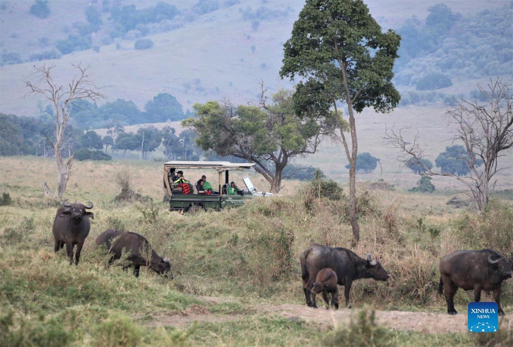 Tourists go sightseeing at the Masai Mara National Reserve, Kenya, Aug. 30, 2021. Kenya is seeking to lure more visitors for the remainder of the year amid the recovery of the global travel sector. For the first six months of 2021, the country received 305,635 foreign travelers, according to Najib Balala, cabinet secretary of Ministry of Tourism and Wildlife. (Xinhua/Dong Jianghui)
