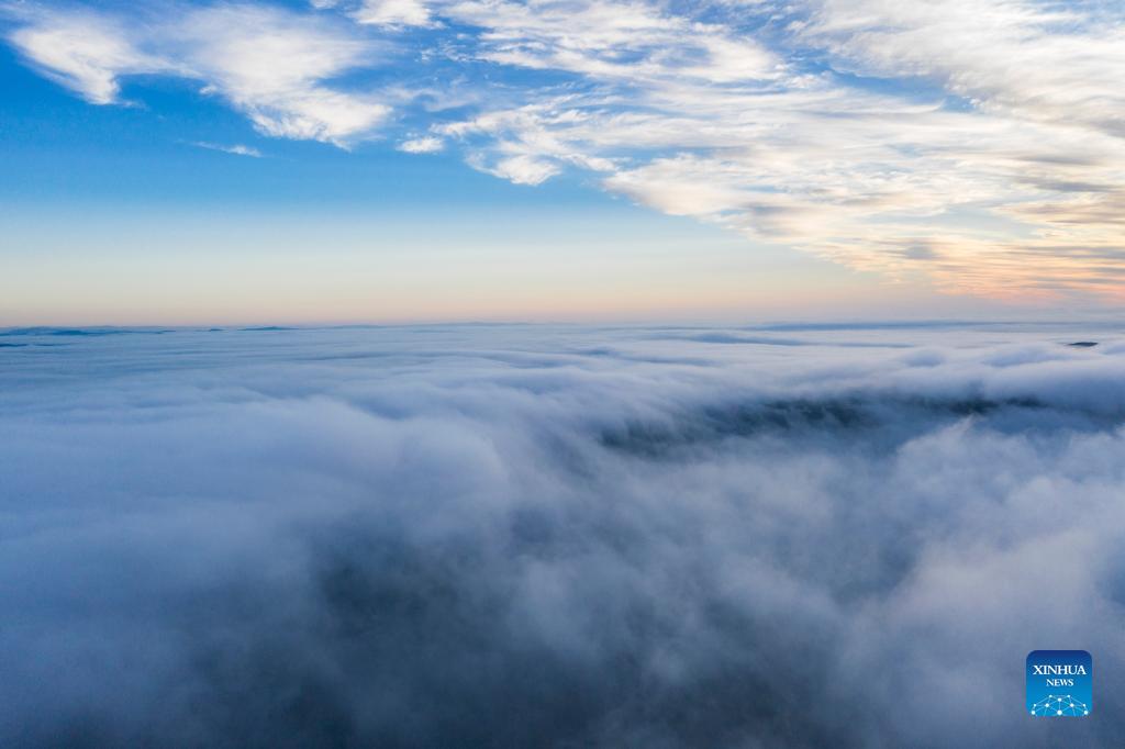 Aerial photo taken on Sept. 17, 2021 shows a view of the Jingpohu Global Geopark at dawn in Mudanjiang, northeast China's Heilongjiang Province. (Xinhua/Xie Jianfei)