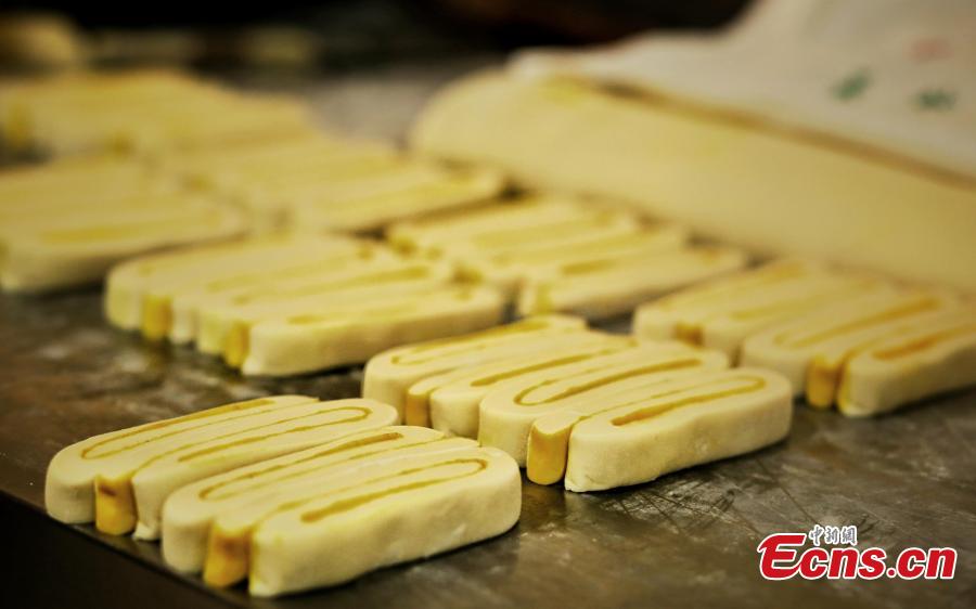 Photo shows dough are cut into strips to be used for mooncakes in Yuzhong County, northwest China's Gansu Province. (Photo: China News Service/Zhang Wen)