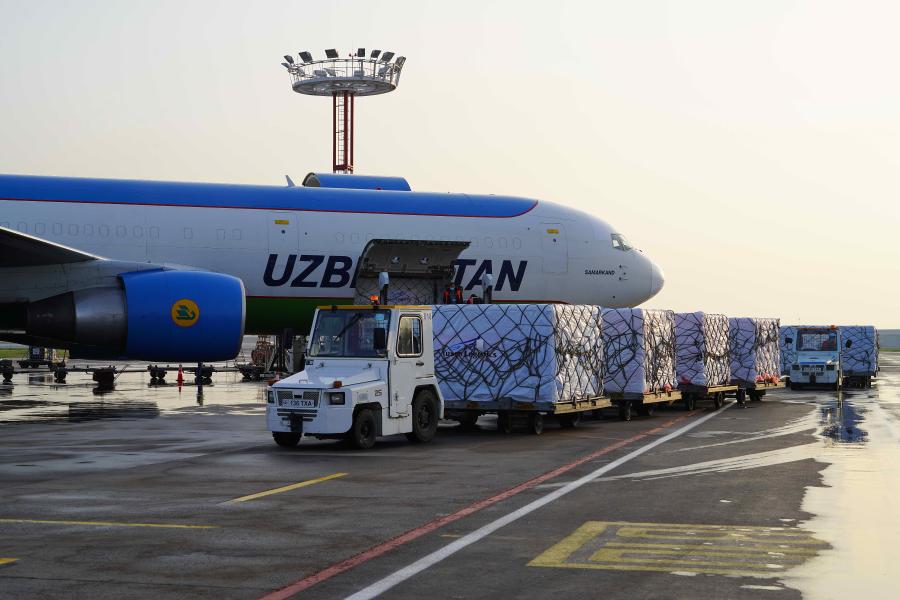 The first batch of Chinese COVID-19 vaccines arrived at Tashkent International Airport in Tashkent, Uzbekistan, on March 27, 2021. (Photo by Zafar Khalilov/Xinhua)