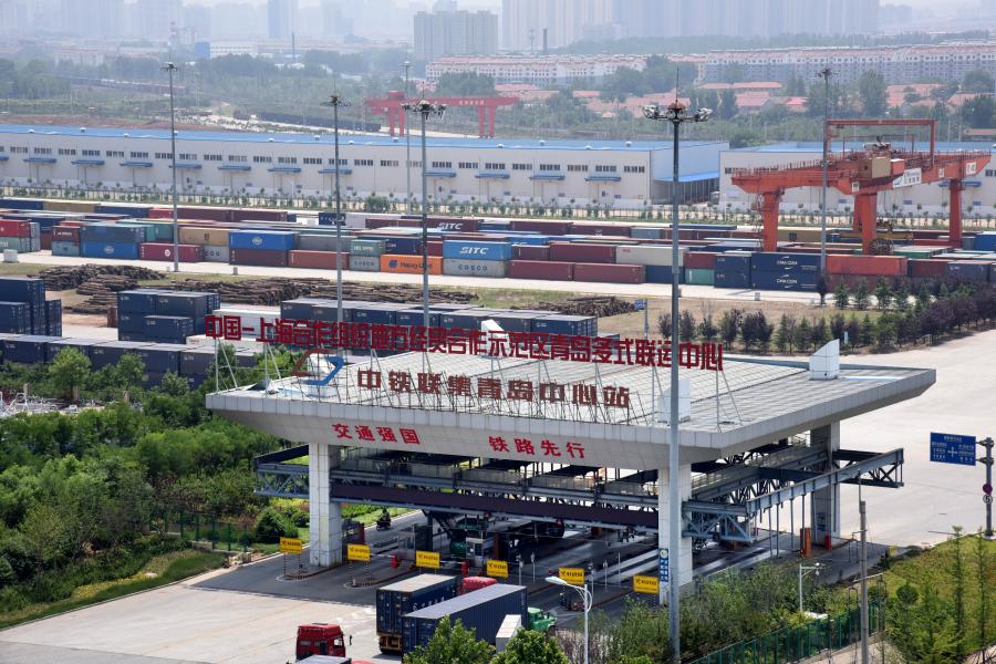 Photo taken on June 12, 2019 shows the Qingdao multimodal transportation center in the China-SCO local economic and trade cooperation demonstration zone in Qingdao, east China's Shandong Province. (Xinhua/Li Ziheng)