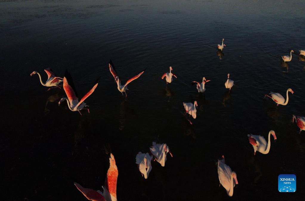 Aerial photo taken on Sept. 17, 2021 shows flamingos in Mogan Lake in Ankara, Turkey. (Photo by Mustafa Kaya/Xinhua)