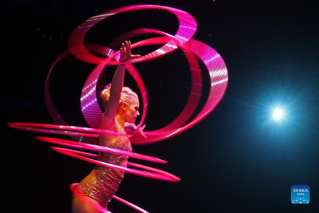 An artist performs during a rehearsal for "La Clique" circus cabaret show at Singapore's Marina Bay Sand convention hall on Sept. 17, 2021. (Photo by Then Chih Wey/Xinhua)