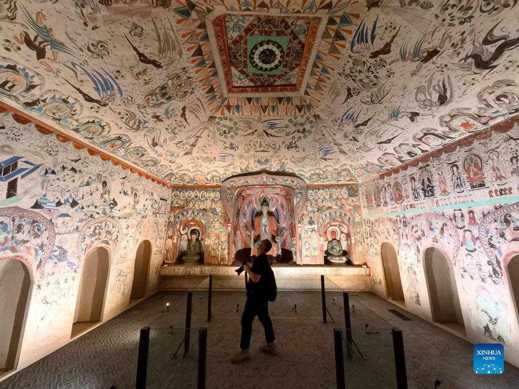 A visitor takes photos of exhibits at an exhibition themed on Dunhuang culture at the Palace Museum, also known as the Forbidden City, in Beijing, capital of China, Sept. 17, 2021. (Xinhua/Li Xin)