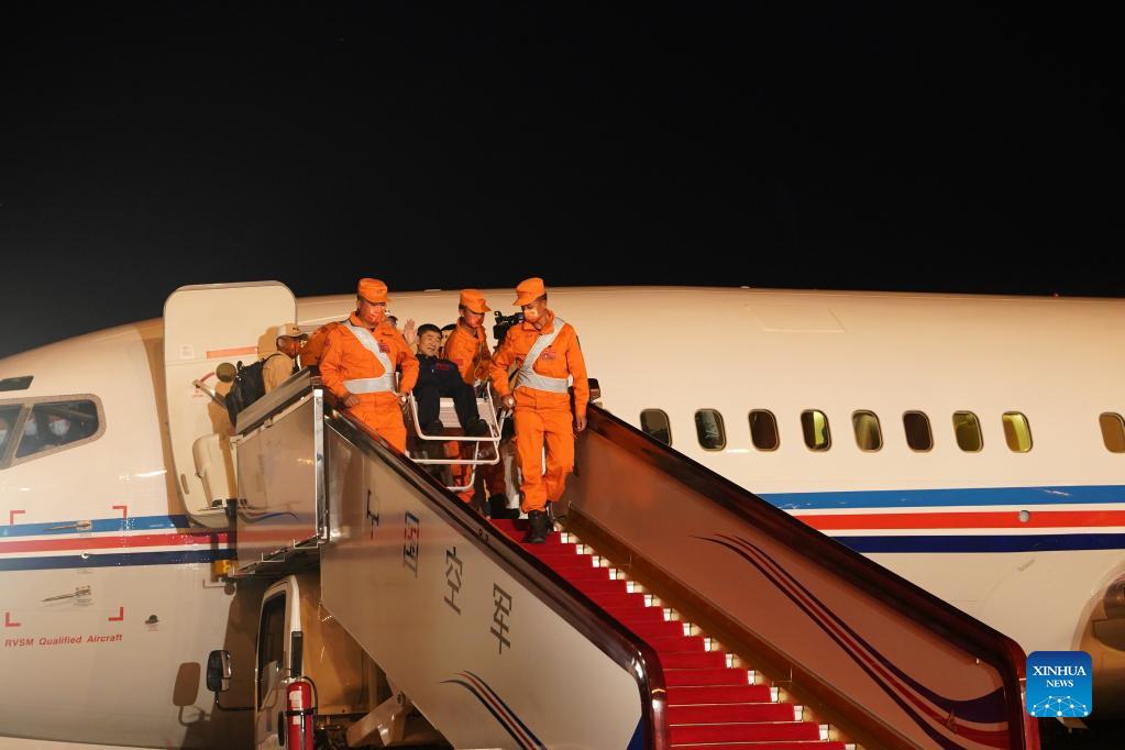 Astronaut Liu Boming waves to the crowd on his arrival in Beijing, capital of China, Sept. 17, 2021. Three Chinese astronauts, the first sent to orbit for space station construction, have completed their three-month mission and returned to Earth safely on Friday. They arrived in Beijing by plane Friday night. (Photo by Guo Zhongzheng/Xinhua)