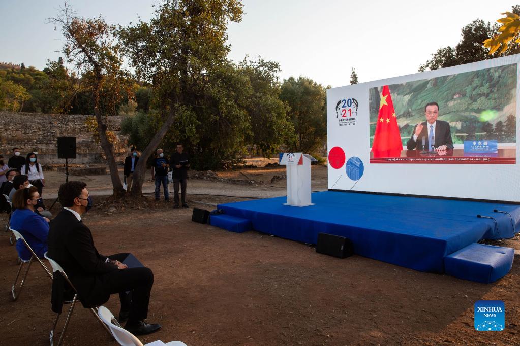 Photo taken in Athens, Greece on Sept. 16, 2021 shows Chinese Premier Li Keqiang speaking in a video speech to the opening ceremony of the China-Greece Year of Culture and Tourism in Beijing, capital of China. The China-Greece Year of Culture and Tourism opened on Thursday with a ceremony held at the foot of the Athens Acropolis, as officials of both sides expressed confidence in a stronger friendship and further cooperation between the two peoples. (Xinhua/Marios Lolos)