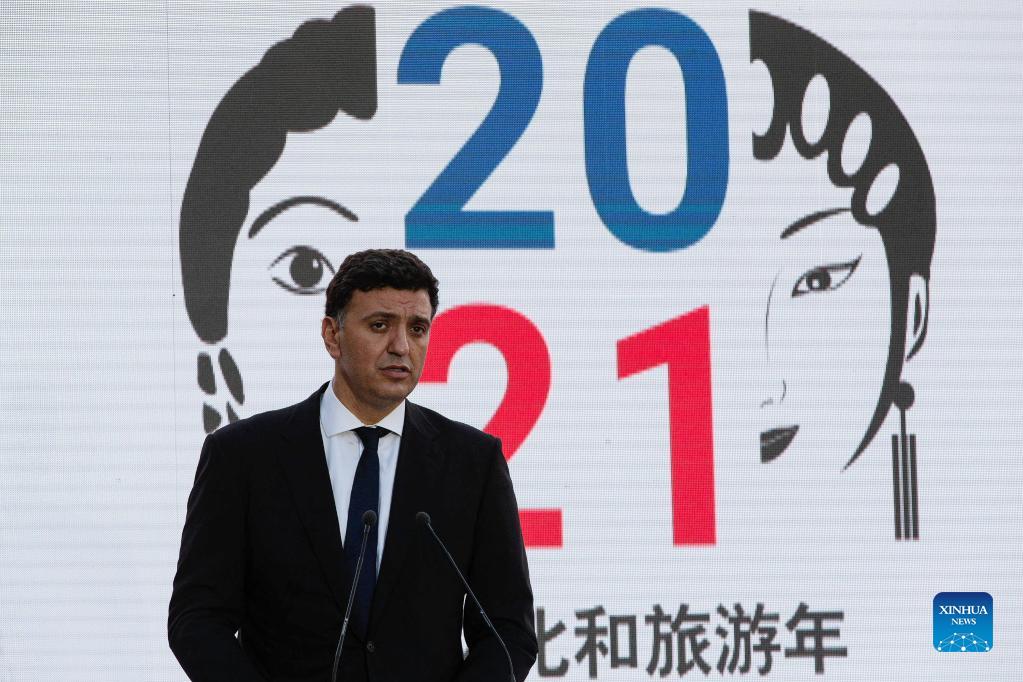 Greek Minister of Tourism Vassilis Kikilias speaks during the opening ceremony of the China-Greece Year of Culture and Tourism, in Athens, Greece on Sept. 16, 2021. The China-Greece Year of Culture and Tourism opened on Thursday with a ceremony held at the foot of the Athens Acropolis, as officials of both sides expressed confidence in a stronger friendship and further cooperation between the two peoples. (Xinhua/Marios Lolos)