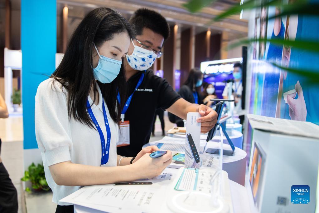 A visitor experiences an AI translation device at the 2021 World Computing Conference in Changsha, central China's Hunan Province, Sept. 17, 2021. (Xinhua/Chen Sihan)