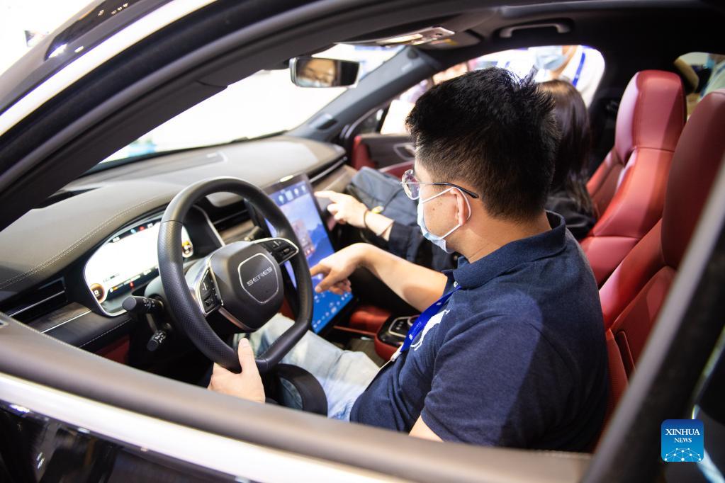 A visitor experiences an intelligent car at the 2021 World Computing Conference in Changsha, central China's Hunan Province, Sept. 17, 2021. (Xinhua/Chen Sihan)