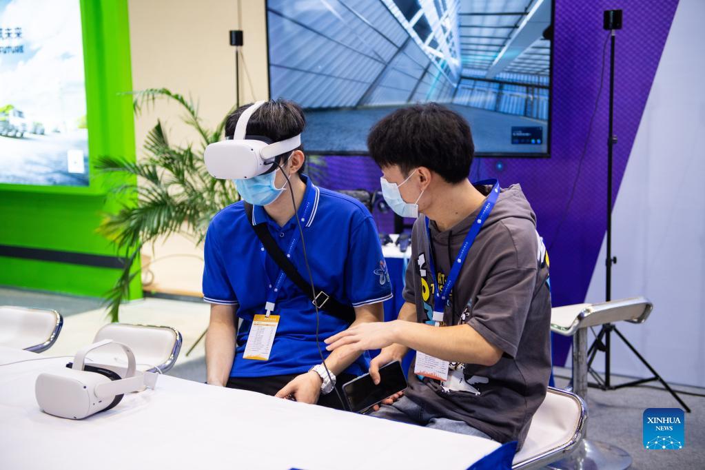 A visitor experiences a virtual reality (VR) device at the 2021 World Computing Conference in Changsha, central China's Hunan Province, Sept. 17, 2021. (Xinhua/Chen Sihan)
